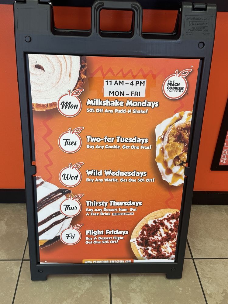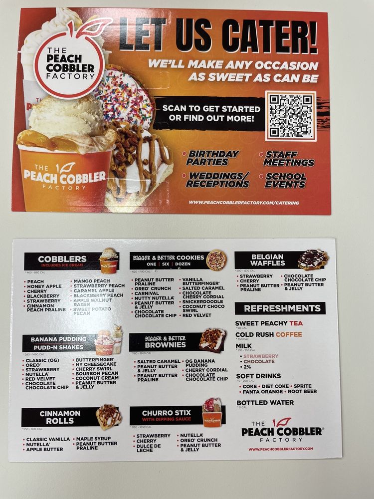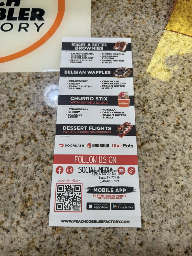 Introducing The Peach Cobbler Factory, a veteran-owned dessert paradise in Katy, TX, specializing in waffles, desserts, and juice bars & smoothies. This cozy spot offers delivery, takeout, and catering, making it a convenient choice for any occasion. The menu boasts a variety of mouthwatering cobblers, with options like peach, cherry, blackberry, and apple, perfectly paired with top-tier ice cream. Customers rave about the generous portions and rich, sweet flavors. The cinnamon sprinkled ice cream adds an extra layer of decadence to the already delicious desserts. Aside from cobblers, they also offer brownies, churros, cookies, and cinnamon rolls. The ambiance is inviting, with free Wi-Fi, wheelchair accessibility, and covered outdoor seating. If you're a cobbler enthusiast looking for a new favorite spot, The Peach Cobbler Factory is a must-visit.